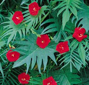 Description: Attention-getting twining vine with trumpet-shaped bright, scarlet flowers measuring 1 in. across. Easy care and vigorous growth. Blooms from early summer until frost. Showy palm-shaped foliage is perfect for training around decks, railings or mailboxes. Eye catching. Vine will grow 6-20 feet. Attractive to bees, butterflies or birds. Annual.